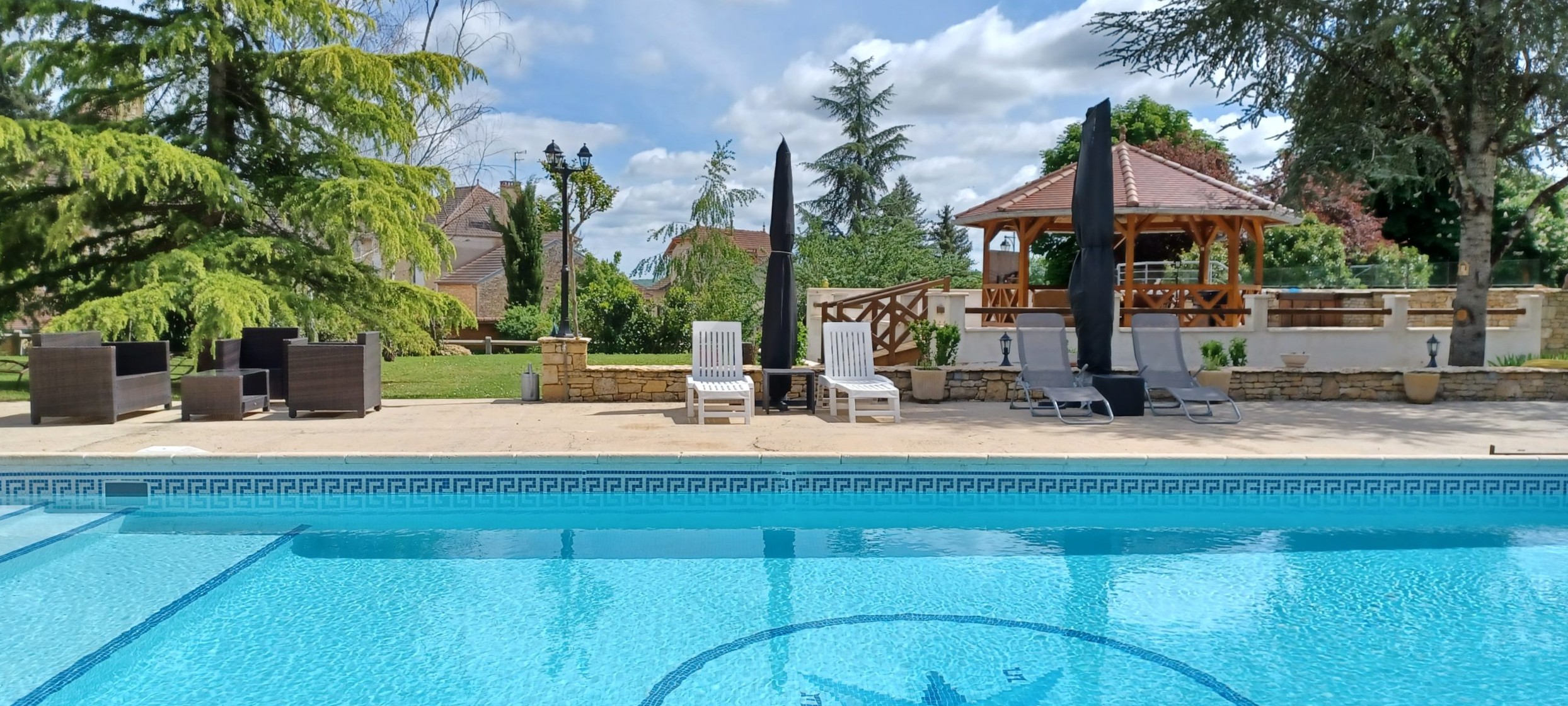 Profitez d’une grande piscine entourée d’un jardin verdoyant, équipée de chaises longues et de parasols pour des moments de détente en toute tranquillité. Après vos journées à explorer la Dordogne, retrouvez des chambres agréables et reposantes, pensées pour offrir des nuits paisibles et un confort total.